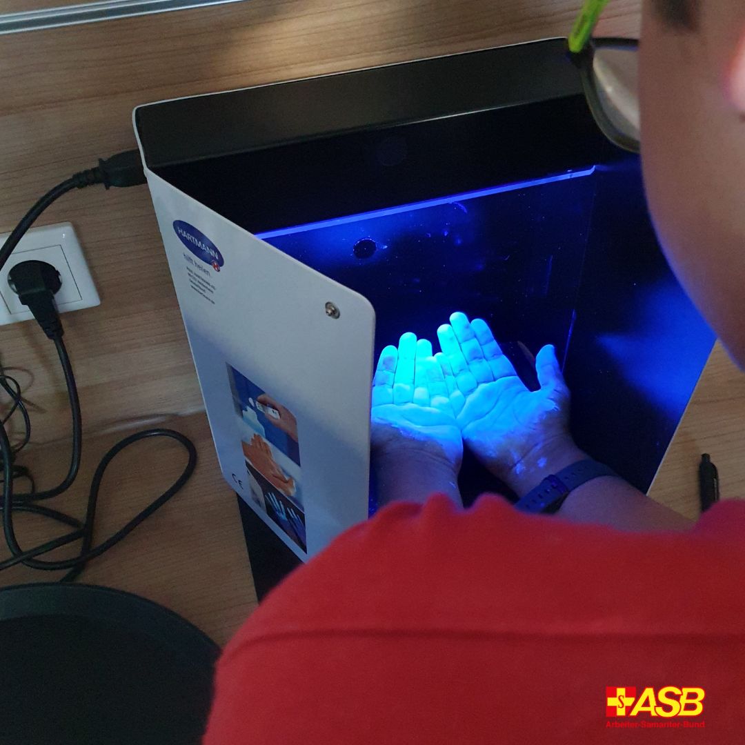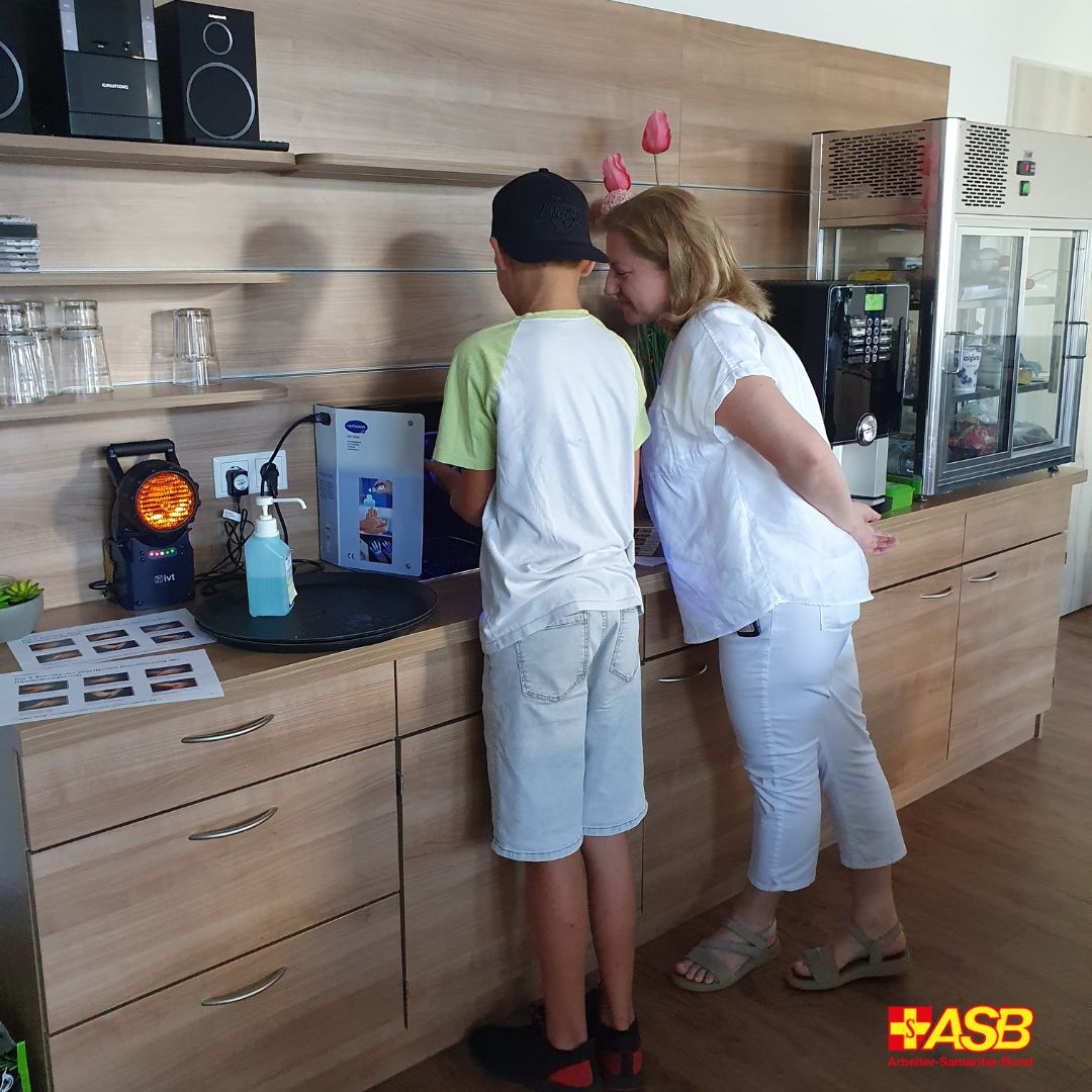 Bei der Auftaktveranstaltung vor den Sommerferien erhielten die Teenager bereits eine Einführung in wichtige Hygienemaßnahmen. Unter Schwarzlicht konnten die 12- bis 14-Jährigen gleich testen, wie gut die Desinfektion ihrer Hände funktioniert hat. Von Oktober bis Januar werden sie dann im „Domizil am Leimbach“ sein. Dort erhalten sie die Gelegenheit, Zeit mit den Bewohnerinnen und Bewohnern zu verbringen und sie zu betreuen. Die Jugendlichen lernen neben wichtigen theoretischen Kenntnissen die einfühlsame Kommunikation und den respektvollen Umgang mit älteren Menschen. Dies fördert nicht nur das Verständnis für die Bedürfnisse der Senioren, sondern auch soziale Kompetenzen und Empathie. Im kommenden Jahr wollen die Senior:innen des ASB-Altenpflegeheims dann das Seniorencafé „ihrer“ Schüler besuchen und vor Ort gleich testen.
